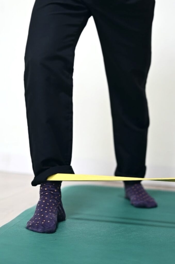 - Ata una banda elástica a un punto fijo y coloca el otro extremo alrededor de la parte media de tu pie.